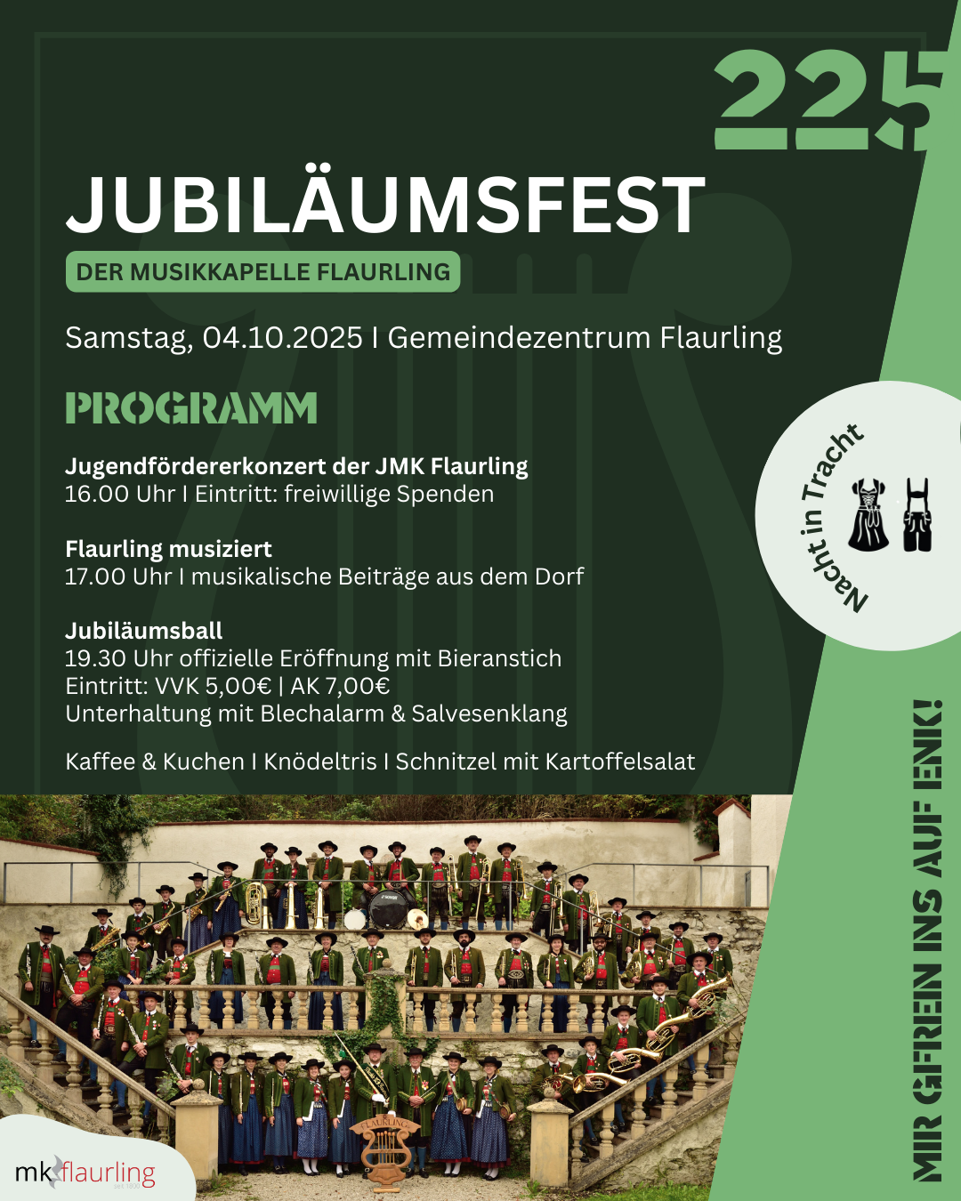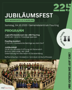 Am 04.10.2025 laden wir alle recht herzlich zu unserem Jubiläumsfest ein. An diesem Abend stehen ein Konzert für unsere Jugendförderer, „Flaurling musiziert“ und unser Jubiläumsball am Programm.